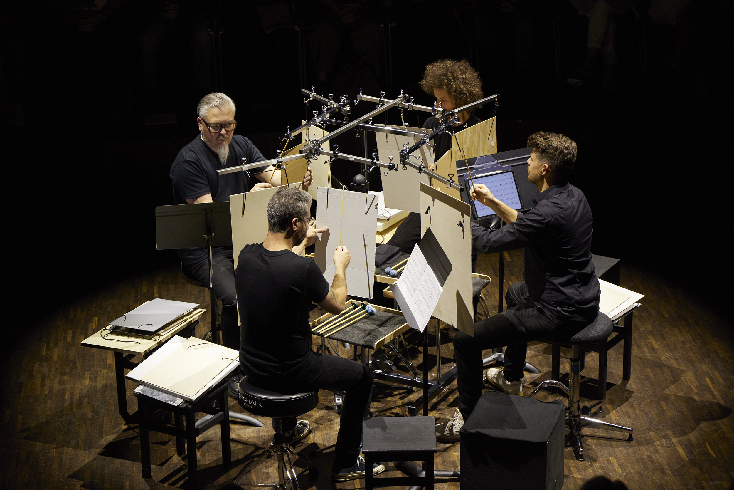 “I am interested in poor sounds. “Poor” as opposed to “noble” sounds, which are not produced by high-tech instruments or devices, high-quality materials, craftsmanship, or exceptional instrument-making. A pencil tapping on a matchbox, a ceramic object sliding across a table. There is a certain immediacy to using a found object or a material fresh from the factory as an instrument. The identity of a sound will then depend as much on its source as on the context in which it is used. In The brown gardener, the four musicians have at their disposal a collection of different materials with seemingly poor acoustic attributes, which they must work delicately to extract their expressive potential.