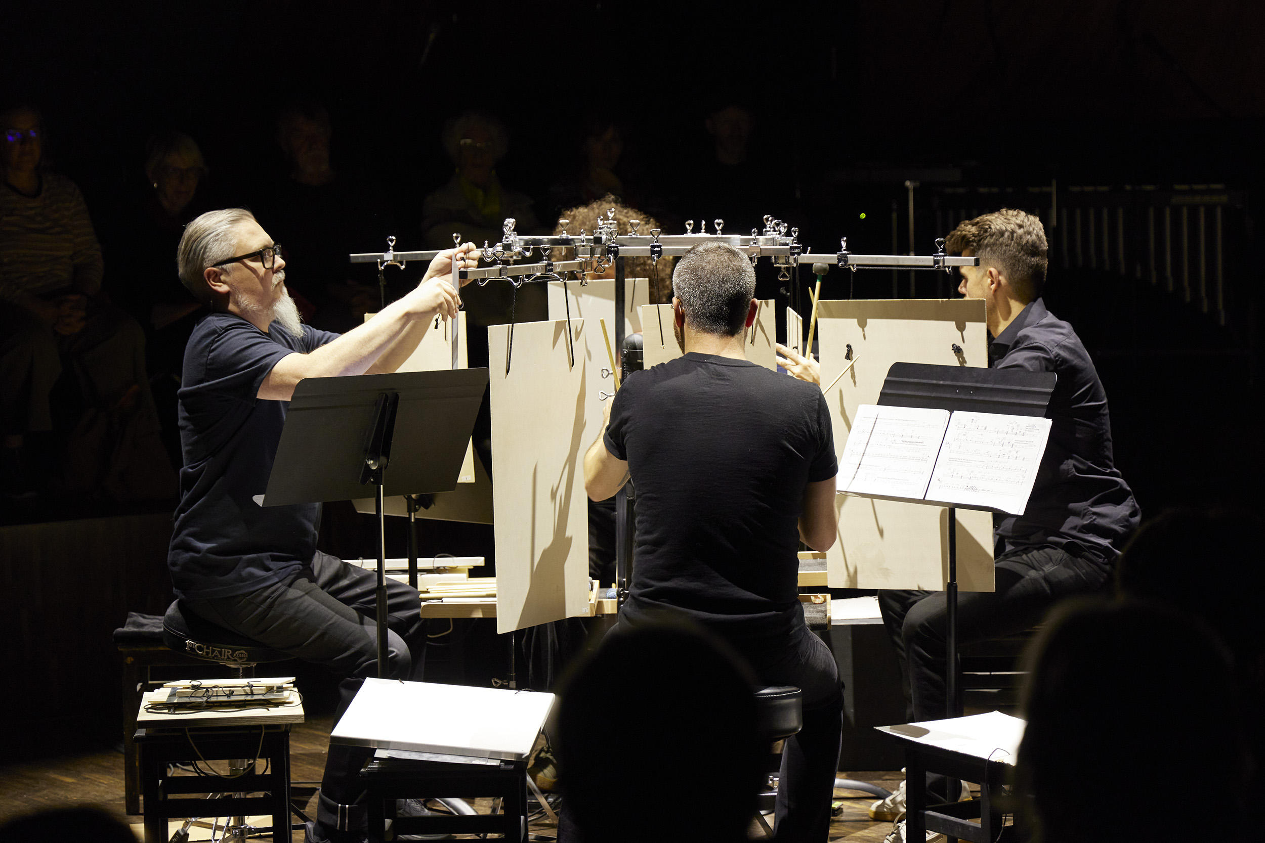 The three members of the trio, Elsa Dorbath (Camerata Ataremac, HANATSUmiroir), Gilles Grimaître (HYPERduo, Collegium Novum Zürich), and Alexandre Babel, engage in a hypnotic exercise of endurance.