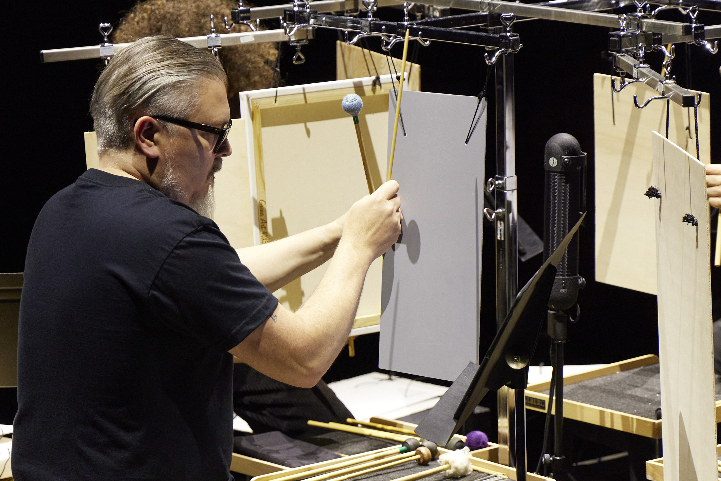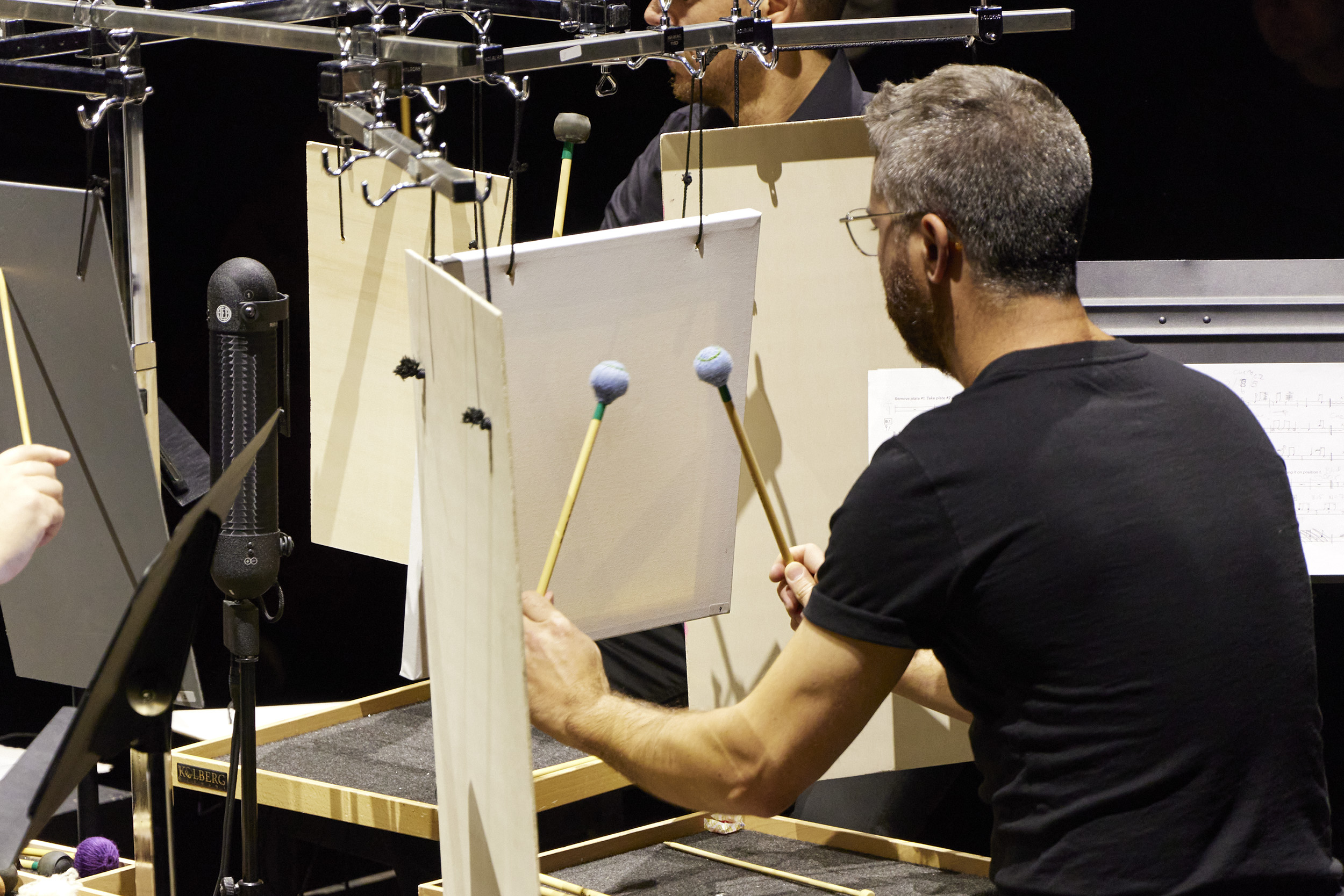 ” In this work, the percussionist is presented as a jack of all trades, surrounded by a rather small collection of instruments that he can reach without having to move too far. Using a pile of aluminium bell plates setup horizontaly, he creates a fast, complex and virtuoso sound discourse that uses rhythm, harmony and superimposed voices in a purely acoustic sound production. In this way, he does not benefit from the support of technological sound enhancement. The difficulty of the task forces him to find solutions, to invent his own path, to build adapted instruments. His gestures and movements are solely responsible for producing the sound, giving him total freedom to take the piece wherever he wants. And even if the performance demands maximum mastery of gestures, the percussionist can also accept the fragility of his movements resulting from the difficult realisation of a virtuoso piece.”